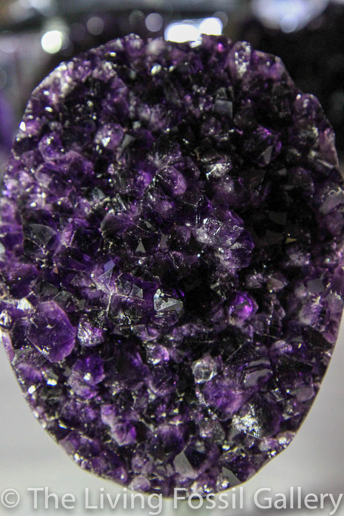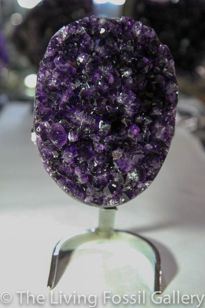 Carved into a classic oval shape, this beautiful amethyst features a full crystal face with its deep amethyst crystal points polished all around its circumference. The back is natural basalt matrix and it is suspended with a custom chrome stand to display it in its best position. A wonderful addition to any room.