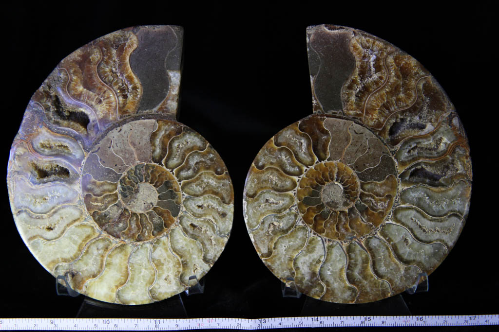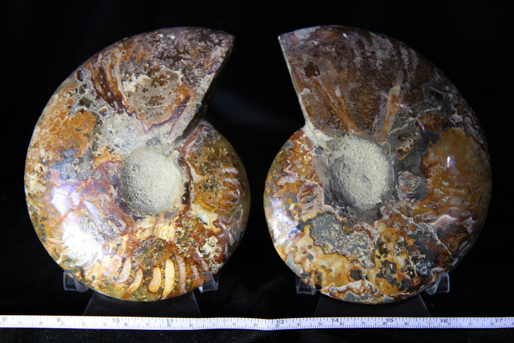 Wonderful crystalline and limestone ammonite halves. Bright suture patterning, and gorgeous mix of khaki limestone, yellow orange crystal and patches of iridescence on the back.