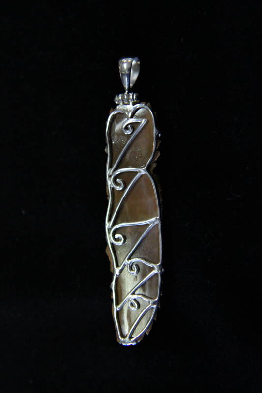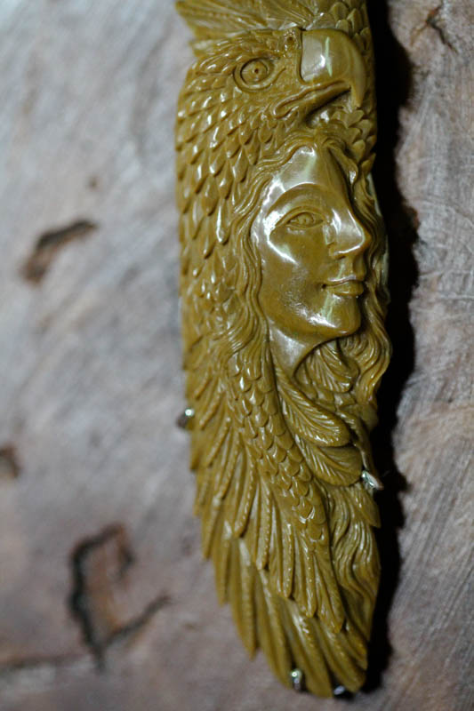 The art speaks for itself. Every detail from iris to pupil, feather to feather markings is present in this masterpiece. In this miniature sculpture, the eagle envelopes a proud face with feathers and plume mixing with long plaits. A spray of feathers covers the background ivory. The mammoth ivory is a wonderful woodlike tan colour while the back shows the curvature of the tusk section. The back solid silver scroll work is wing like and of high quality hand made construction. The bail is hinged. This is a one-off both in terms of the unique ivory colour and in the skill of the individual carving.