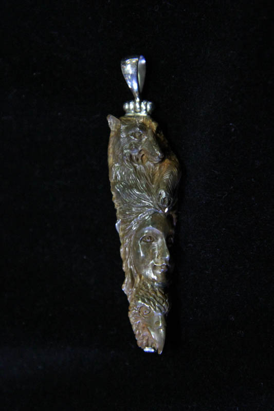 This fantastic pendant incorporates three elements of wolf, woman and eagle at the base. Each of the faces have intricate expression and character and have been carved in full relief so that the faces wrap around the side of the ivory matrix. Dreamlike, the woman’s hair streams into the shag of the wolf and combines seamlessly. The mammoth ivory is a wonderful coppery colour. The back solid silver scroll work is patterned and of high quality hand made construction. The bail is hinged. This is a one-off both in terms of the unique ivory colour and in the skill of the individual carving.